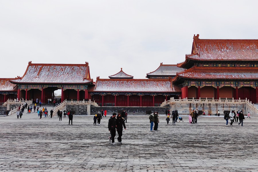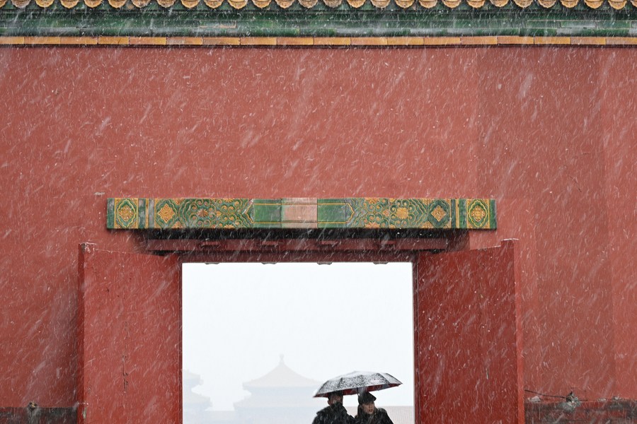 People visit the Palace Museum amid snow in Beijing, capital of China, March 18, 2022. (Xinhua/Yin Dongxun)