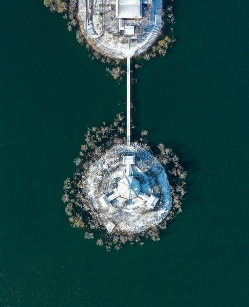 Aerial photo taken on March 19, 2022 shows the snow scenery at a reservoir in Beijing, capital of China. (Xinhua/Li He)