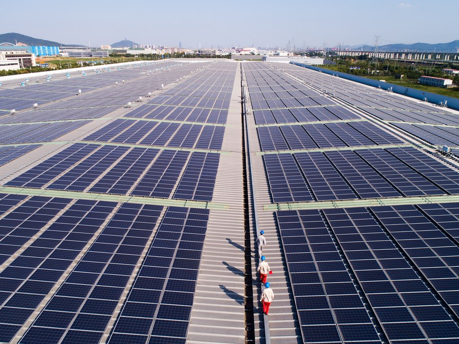 Aerial photo taken on Sept. 19, 2019 shows staff members examining solar panels on the rooftop of a local automobile maker in Huzhou, east China's Zhejiang Province. (Xinhua/Xu Yu)