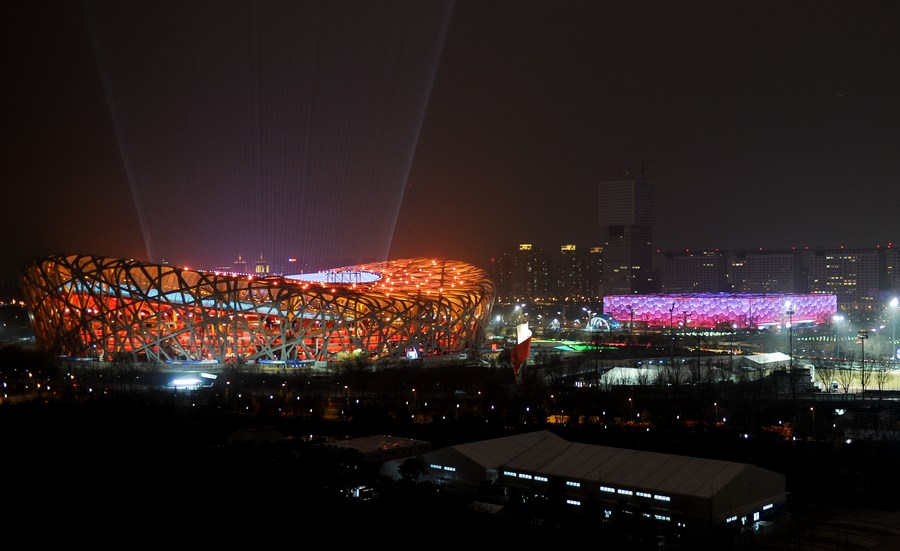 A light show is seen during the closing ceremony of the Beijing 2022 Paralympic Winter Games at the National Stadium in Beijing on March 13, 2022. (Xinhua/Li Renzi)