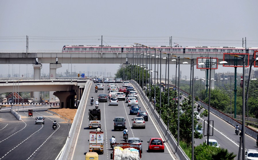 Photo taken on June 7, 2021 shows cars and a metro rail train running respectively on a flyover and a bridge in New Delhi, India. (Str/Xinhua)