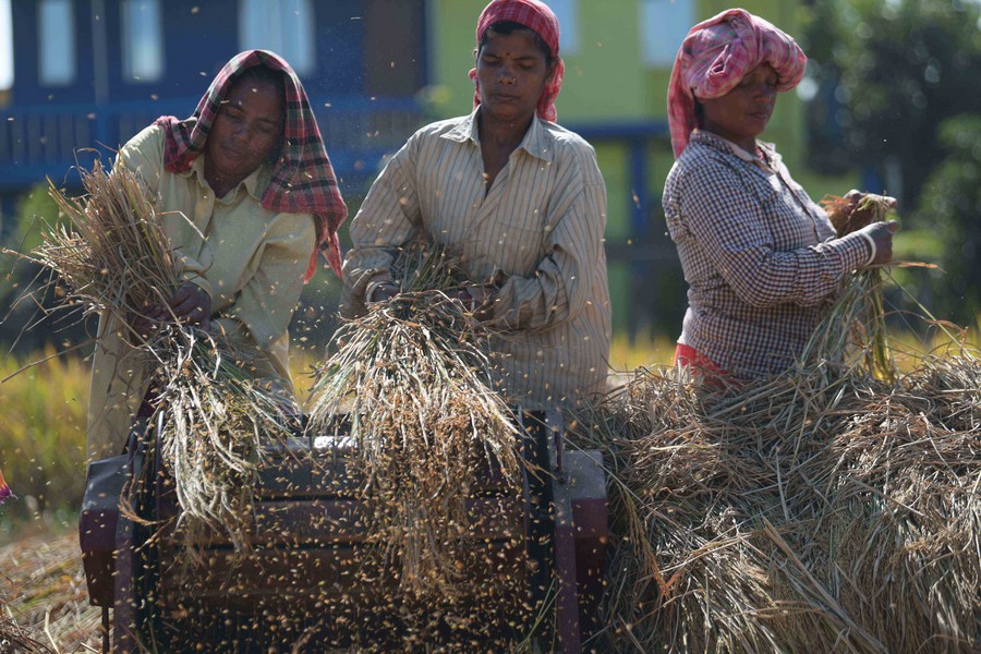 Farmers work in a field in Agartala, capital city of India's northeastern state of Tripura, Nov. 30, 2021. (Str/Xinhua)