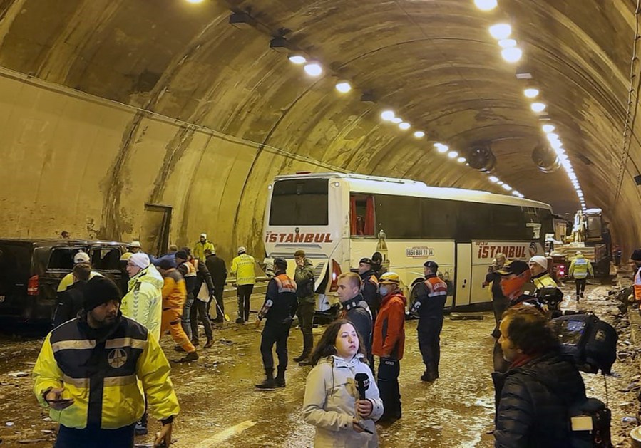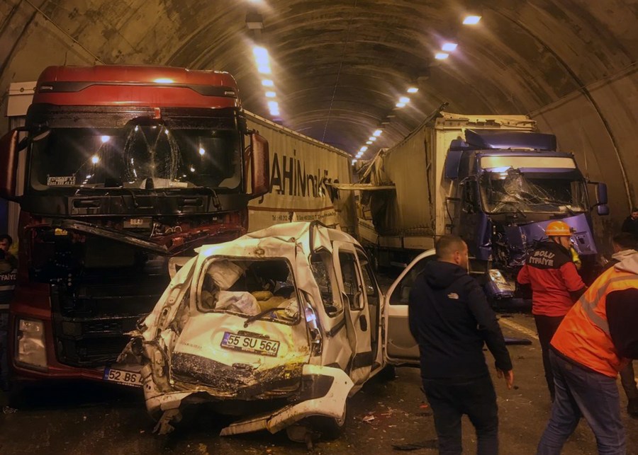 The traffic accident scene in Mount Bolu Tunnel on the Ankara-Istanbul motorway in northwestern Turkey, on March 19, 2022. (Xinhua photo)