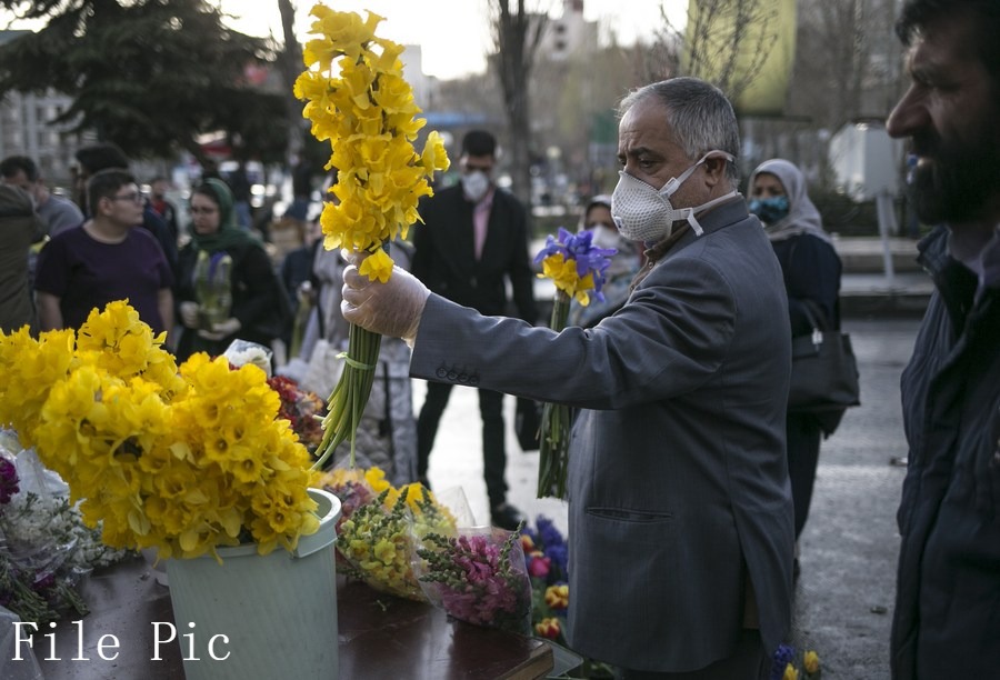 A man wearing a face mask selects flower at a bazaar in Tehran, Iran, March 19, 2020, ahead of Nowruz or the Iranian New Year. (Photo by Ahmad Halabisaz/Xinhua)