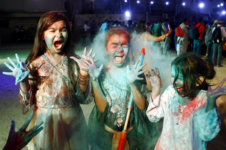 Children participate in celebrations of Holi festival, the festival of colors, in Karachi, Pakistan, on March 17, 2022. (Str/Xinhua)■