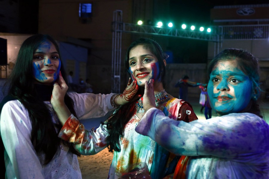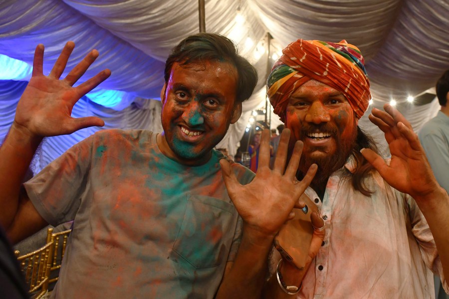People participate in celebrations of Holi festival, the festival of colors, in Karachi, Pakistan, on March 17, 2022. (Str/Xinhua)