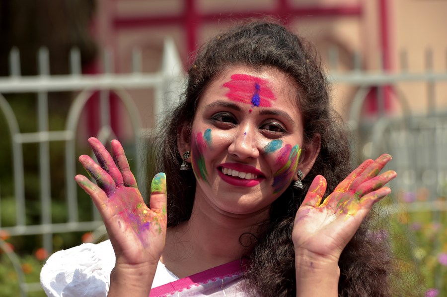 A Hindu girl poses for pictures during the festival of colors in Dhaka, Bangladesh on March 18, 2022. (Xinhua)