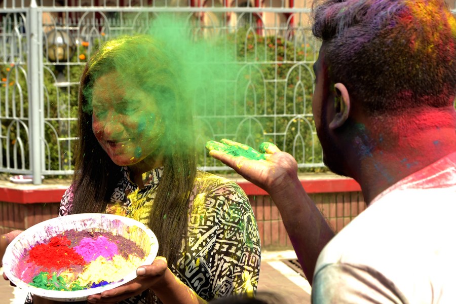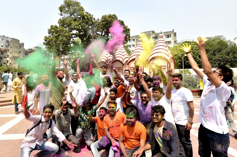 People participate in celebrations of Holi festival, the festival of colors, in Dhaka, Bangladesh on March 18, 2022. (Xinhua)