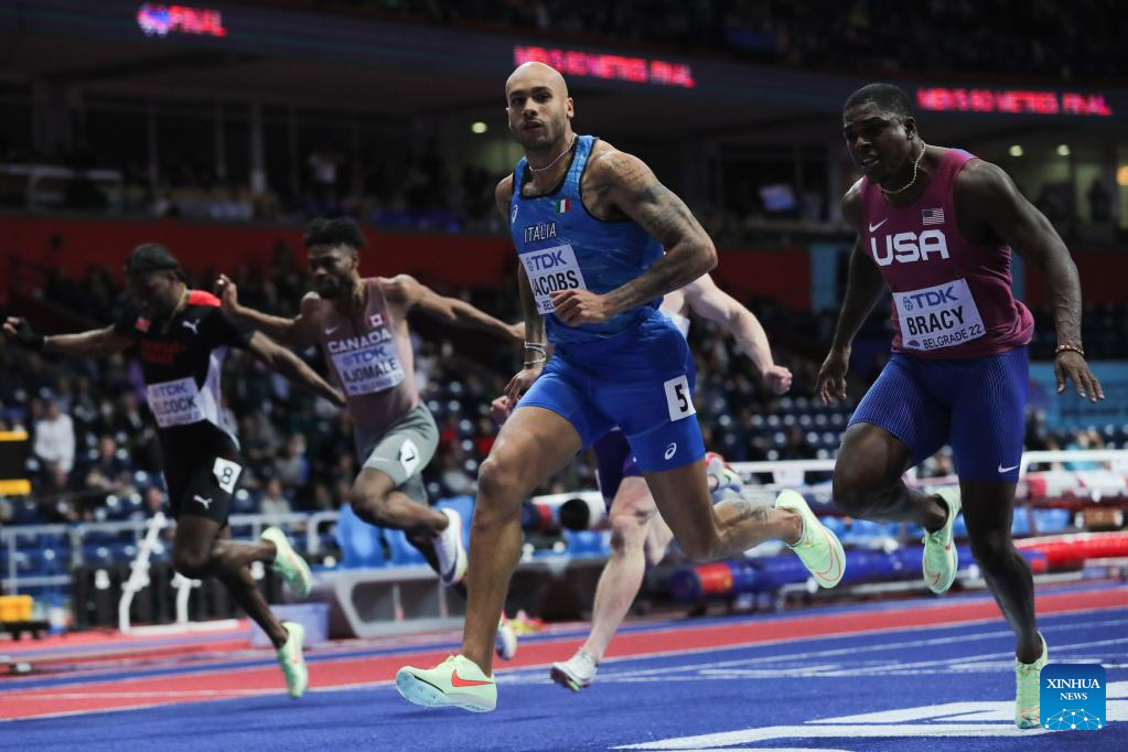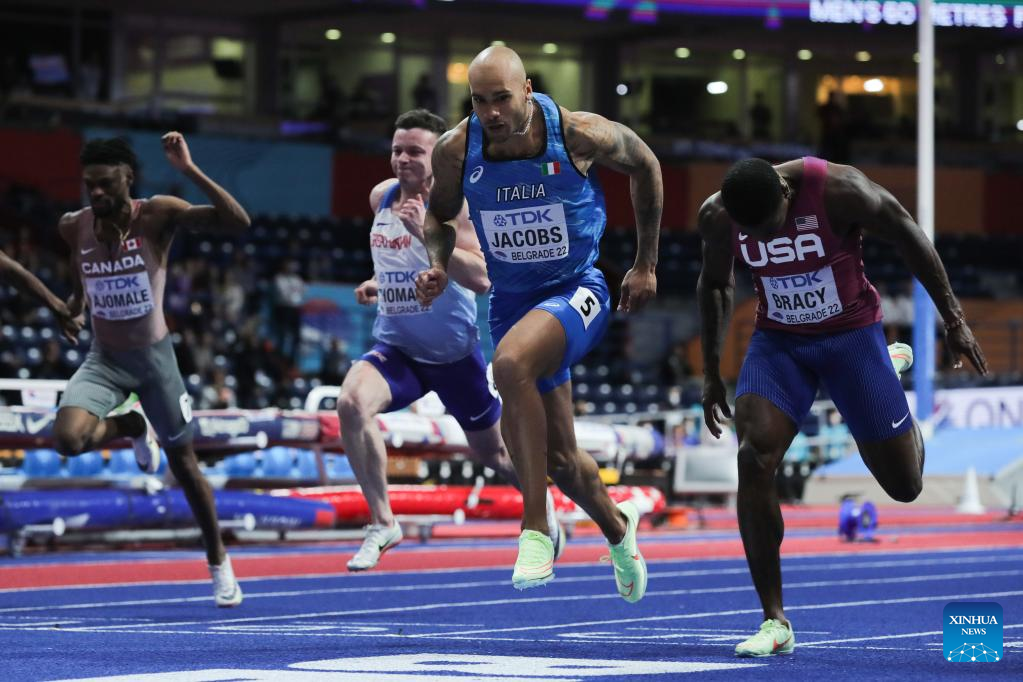 Lamont Marcell Jacobs (2nd R) of Italy crosses the finishing line during the men's 60m final at the World Athletics Indoor Championships Belgrade 2022 in Stark Arena, Belgrade, Serbia, March 19, 2022. (Xinhua/Zheng Huansong)
