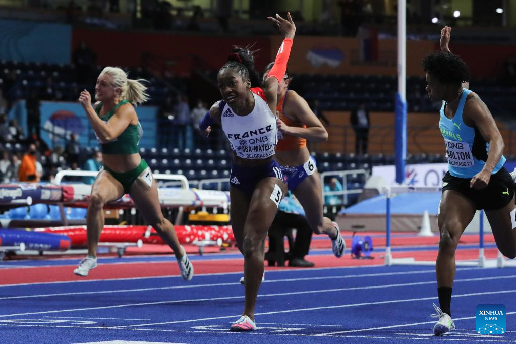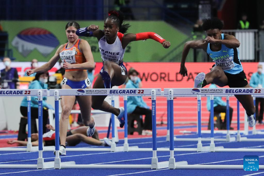 Cyrena Samba-Mayela (C) of France competes during the women's 60m hurdles final at the World Athletics Indoor Championships Belgrade 2022 in Stark Arena, Belgrade, Serbia, March 19, 2022. (Xinhua/Zheng Huansong)