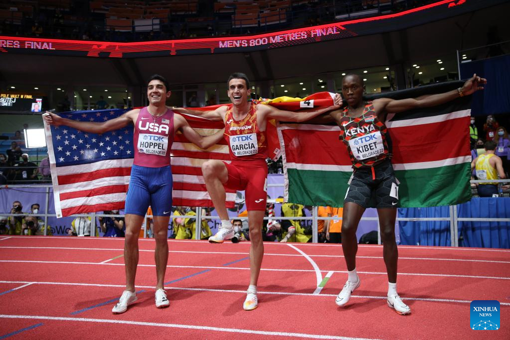 First-placed Spain's Mariano Garcia (C), second-placed Kenya's Noah Kibet (R) and third-placed Bryce Hoppel of the United States celebrate after the men's 800m final at the World Athletics Indoor Championships Belgrade 2022 in Stark Arena, Belgrade, Serbia, March 19, 2022. (Xinhua/Zheng Huansong)