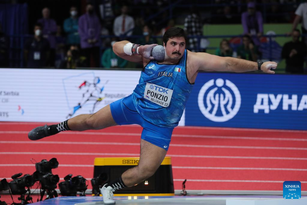 Nick Ponzio of Italy competes during the men's shot put final at the World Athletics Indoor Championships Belgrade 2022 in Stark Arena, Belgrade, Serbia, March 19, 2022. (Xinhua/Zheng Huansong)