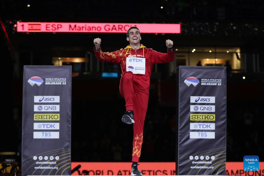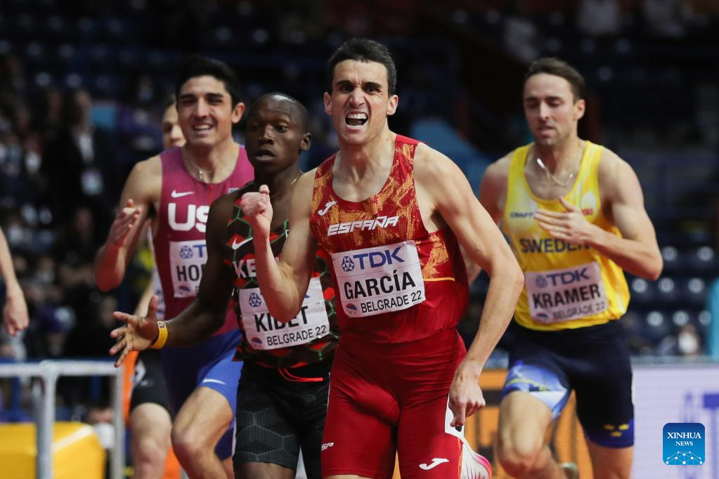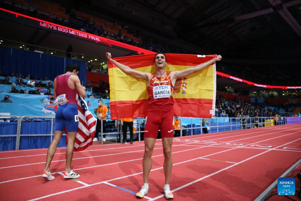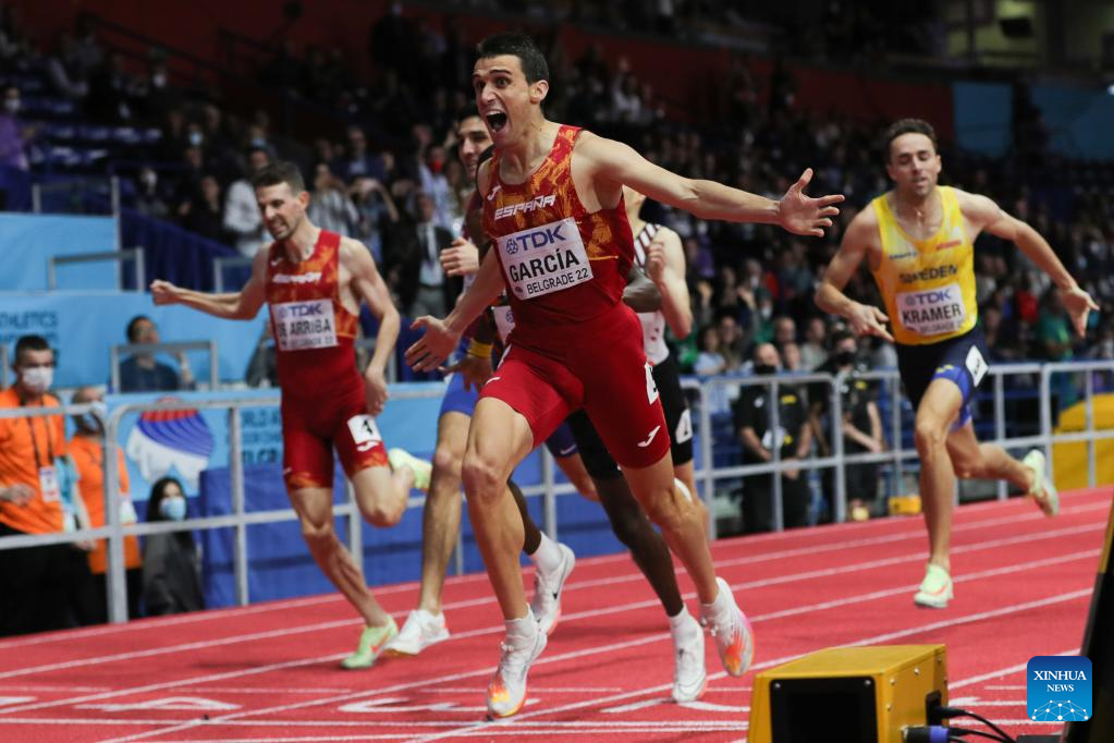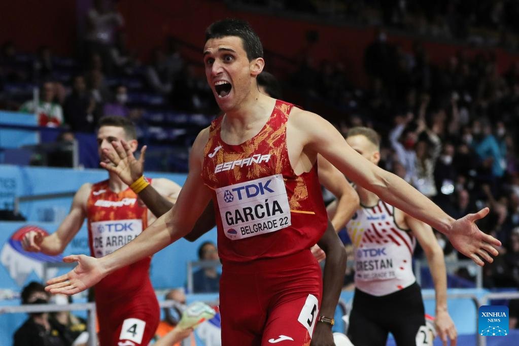 Spain's Mariano Garcia celebrates during the men's 800m final at the World Athletics Indoor Championships Belgrade 2022 in Stark Arena, Belgrade, Serbia, March 19, 2022. (Xinhua/Zheng Huansong)
