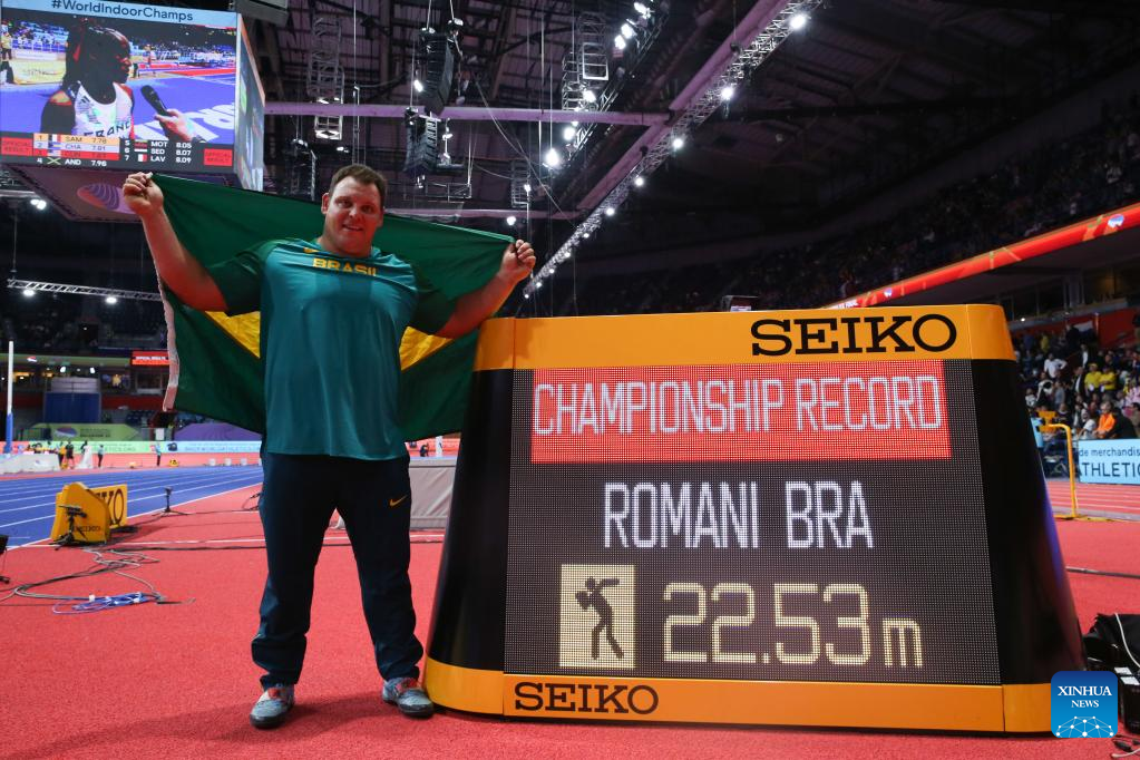 Darlan Romani of Brazil poses with the championship record board after the men's shot put final at the World Athletics Indoor Championships Belgrade 2022 in Stark Arena, Belgrade, Serbia, March 19, 2022. (Xinhua/Zheng Huansong)