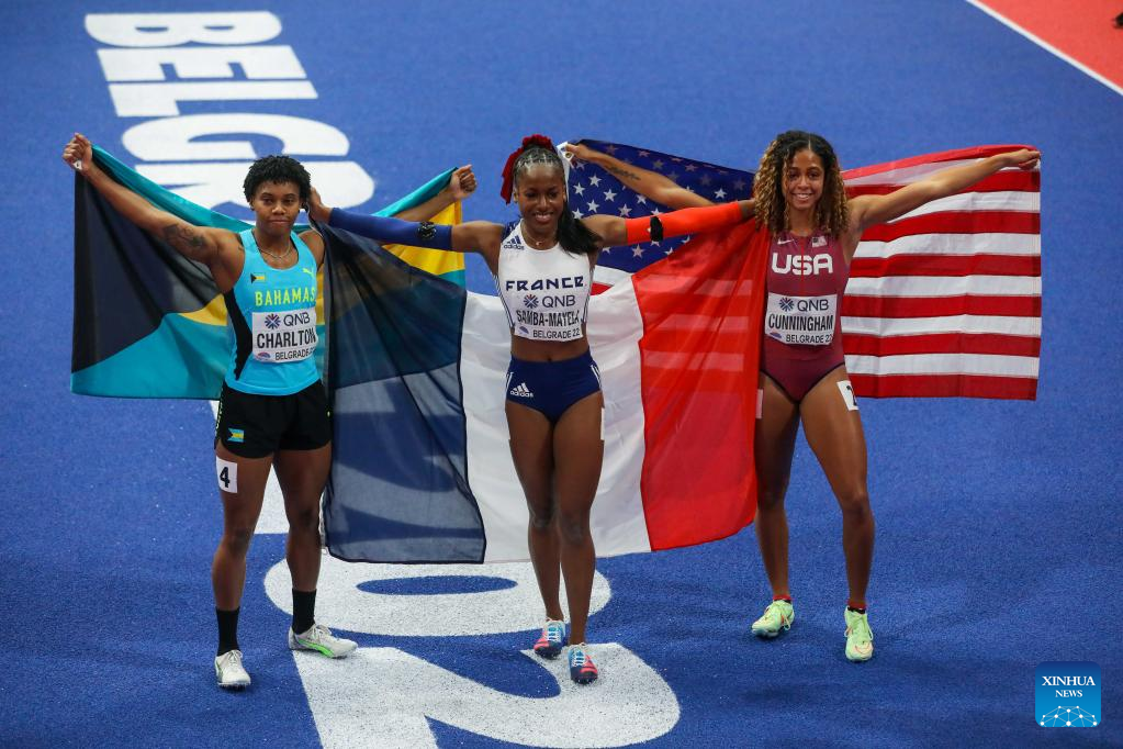 First-placed Cyrena Samba-Mayela (C) of France, second-placed Devynne Charlton (L) of Bahamas and third-placed Gabriele Cunningham of the United States pose after the women's 60m hurdles final at the World Athletics Indoor Championships Belgrade 2022 in Stark Arena, Belgrade, Serbia, March 19, 2022. (Xinhua/Shi Zhongyu)