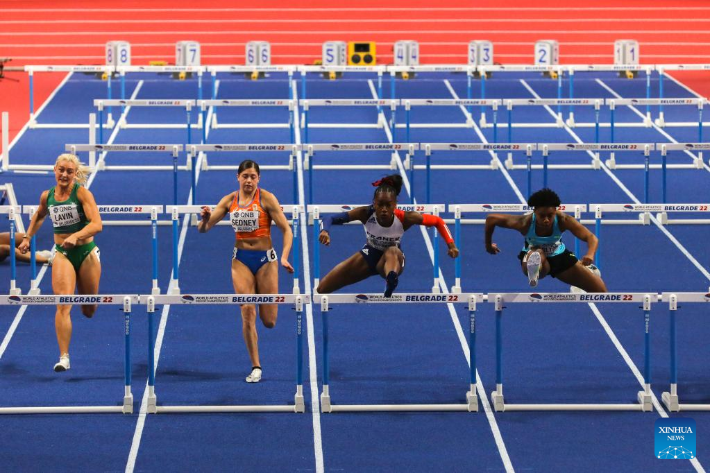 Athletes compete during the women's 60m hurdles final at the World Athletics Indoor Championships Belgrade 2022 in Stark Arena, Belgrade, Serbia, March 19, 2022. (Xinhua/Shi Zhongyu)