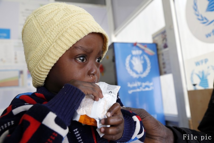A malnourished child has his food inside a malnutrition ward supported by humanitarian agencies including the World Food Programme (WFP), at Al-Sabeen hospital in Sanaa, Yemen, on Oct. 10, 2020. (Photo by Mohammed Mohammed/Xinhua)