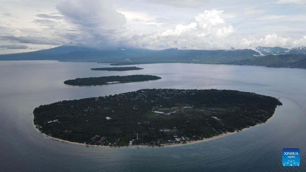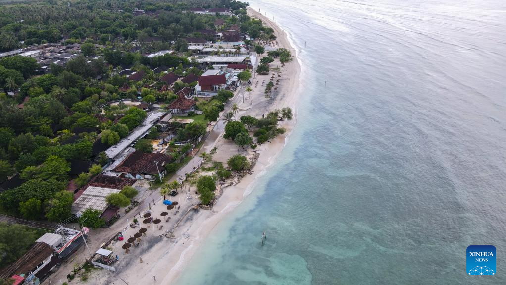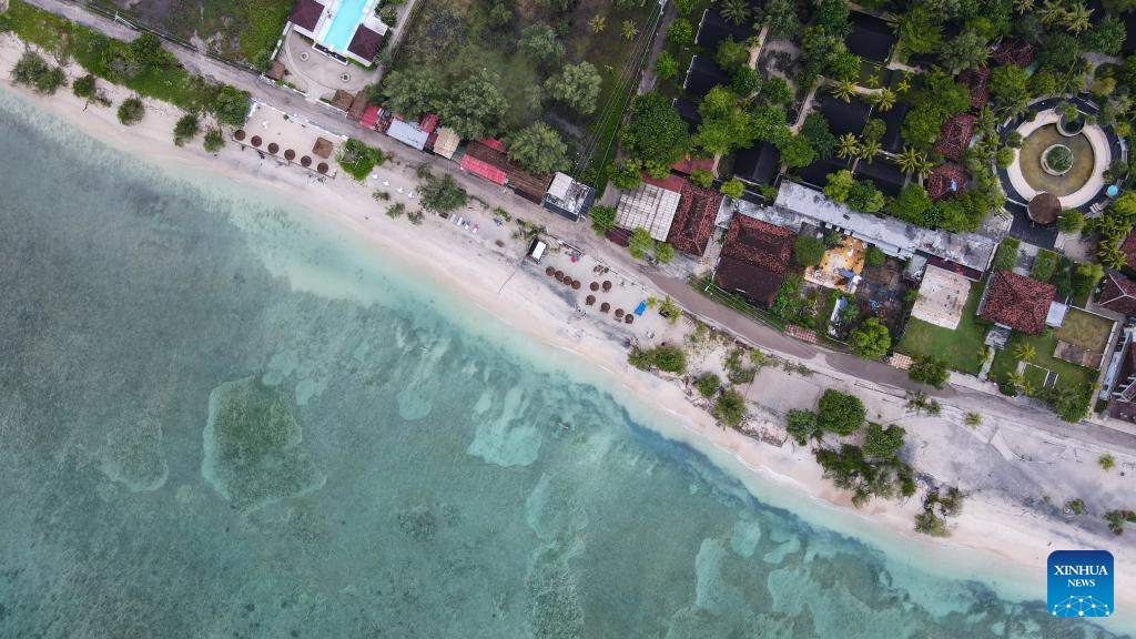 Aerial photo taken on March 18, 2022, shows the beach of Gili Trawangan of Lombok Island, in Indonesia. Lombok Island belongs to West Nusa Tenggara Province of Indonesia. Separated from Bali Island by the Lombok Strait in the west, Lombok Island's clear beaches, neat farmland, waterfalls hidden in tropical rain forests and other unique scenery make it an ideal tourist destination. (Xinhua/Xu Qin)