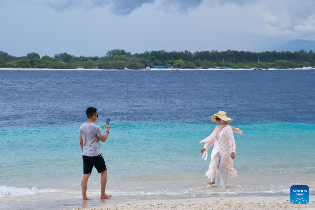 Tourists take photos on the beach of Gili Trawangan, one of the three Gili islands in Lombok, Indonesia on March 18, 2022. Lombok Island belongs to West Nusa Tenggara Province of Indonesia. Separated from Bali Island by the Lombok Strait in the west, Lombok Island's clear beaches, neat farmland, waterfalls hidden in tropical rain forests and other unique scenery make it an ideal tourist destination. (Xinhua/Xu Qin)