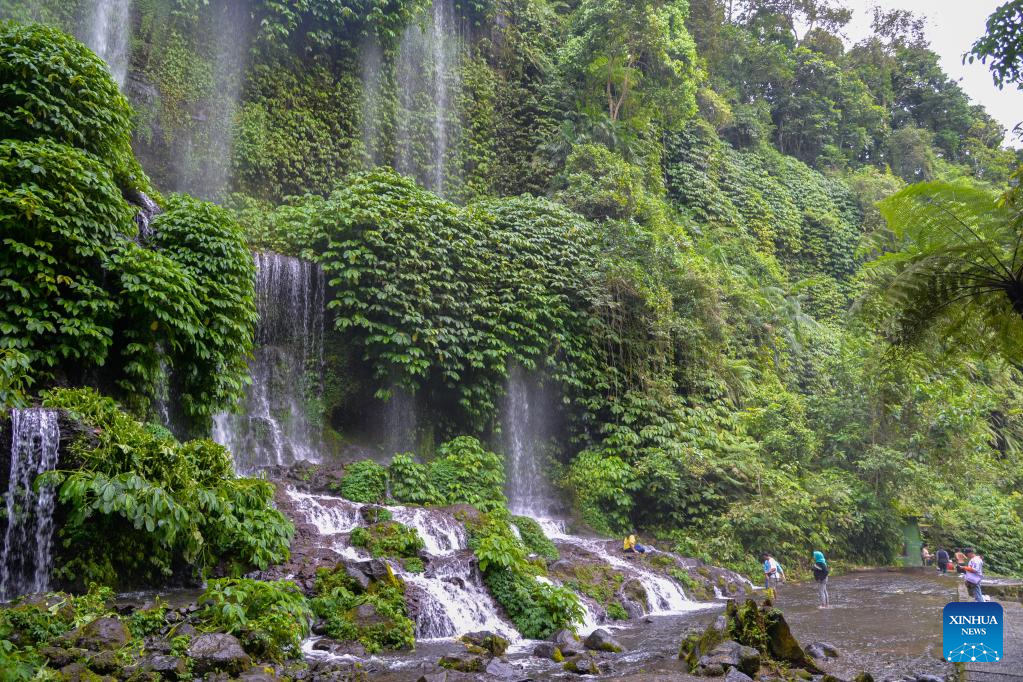 Tourists are seen by the Benang Kelambu waterfalls of Lombok Island, in Indonesia on March 19, 2022. Lombok Island belongs to West Nusa Tenggara Province of Indonesia. Separated from Bali Island by the Lombok Strait in the west, Lombok Island's clear beaches, neat farmland, waterfalls hidden in tropical rain forests and other unique scenery make it an ideal tourist destination. (Xinhua/Xu Qin)