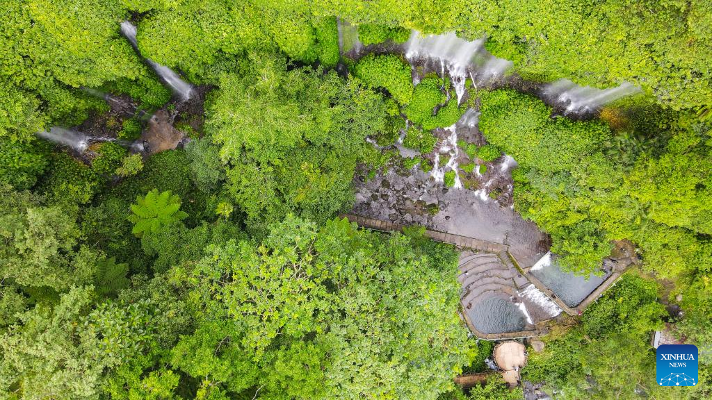 Aerial photo taken on March 19, 2022, shows Benang Kelambu waterfalls, which are hidden in the rainforest of Lombok Island, in Indonesia. Lombok Island belongs to West Nusa Tenggara Province of Indonesia. Separated from Bali Island by the Lombok Strait in the west, Lombok Island's clear beaches, neat farmland, waterfalls hidden in tropical rain forests and other unique scenery make it an ideal tourist destination. (Xinhua/Xu Qin)