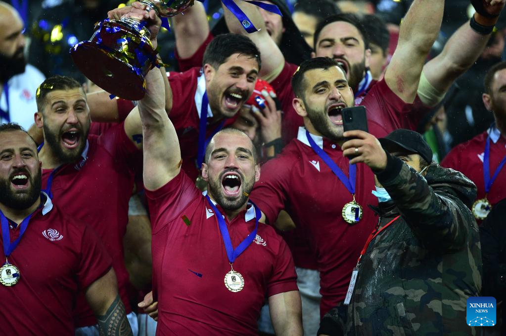 Georgia's players celebrate after winning the final match of the Rugby European Championship 2022 between Georgia and Spain in Tbilisi, Georgia, March 20, 2022. (Photo by Tamuna Kulumbegashvili/Xinhua)