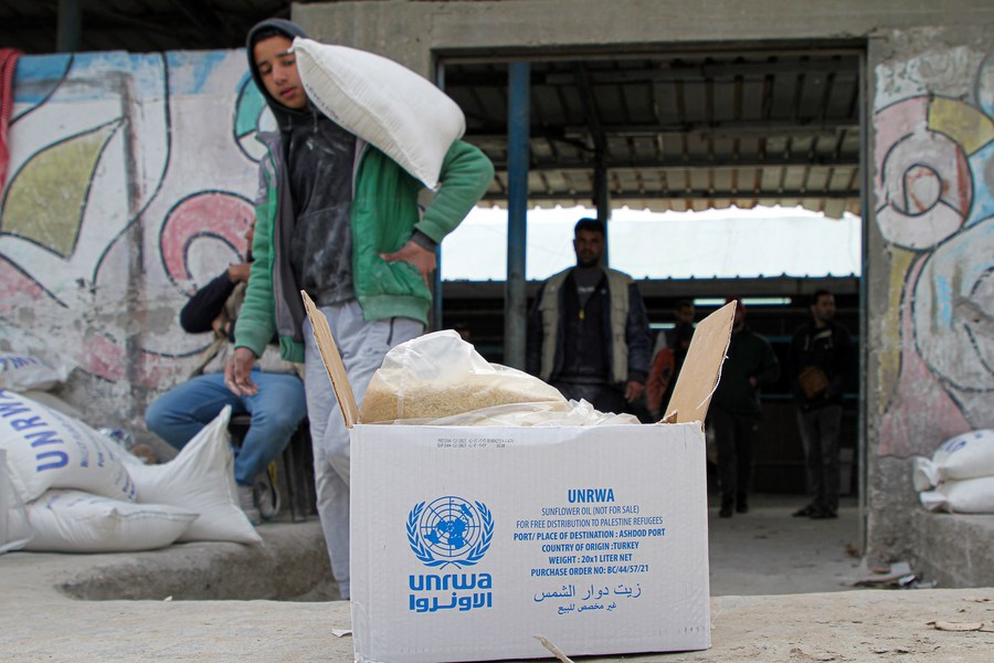A refugee receives food from a distribution center of the United Nations Relief and Works Agency for Palestine Refugees in the Near East (UNRWA) at the Al-Shati refugee camp in Gaza City, March 20, 2022. (Photo by Rizek Abdeljawad/Xinhua)