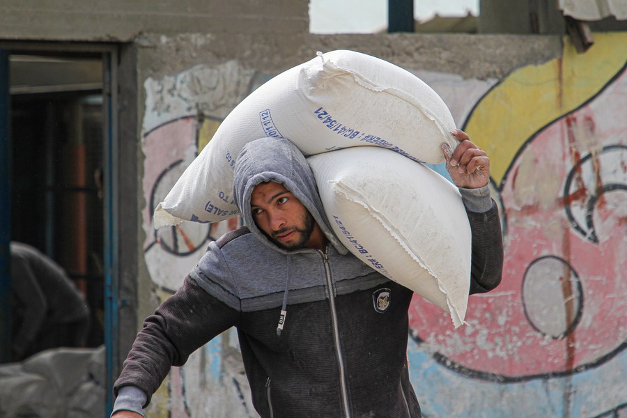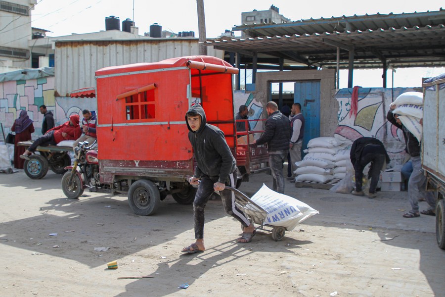 A Palestinian worker transports a cart filled with food from a distribution center of the United Nations Relief and Works Agency for Palestine Refugees in the Near East (UNRWA) at Al-Shati refugee camp in Gaza City, March 20, 2022. (Photo by Rizek Abdeljawad/Xinhua)