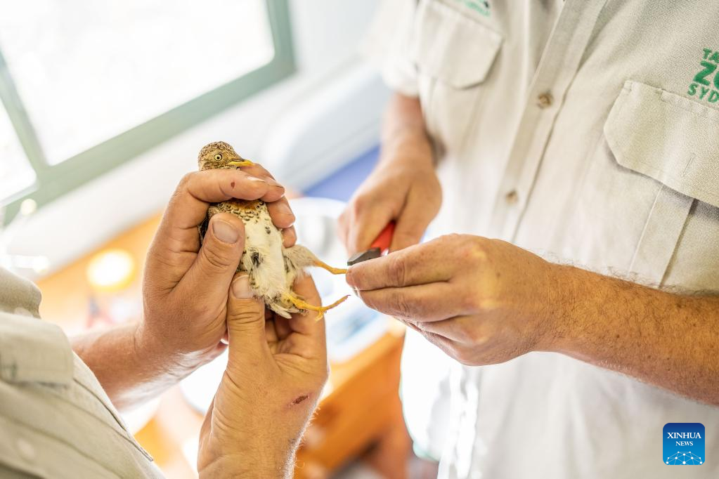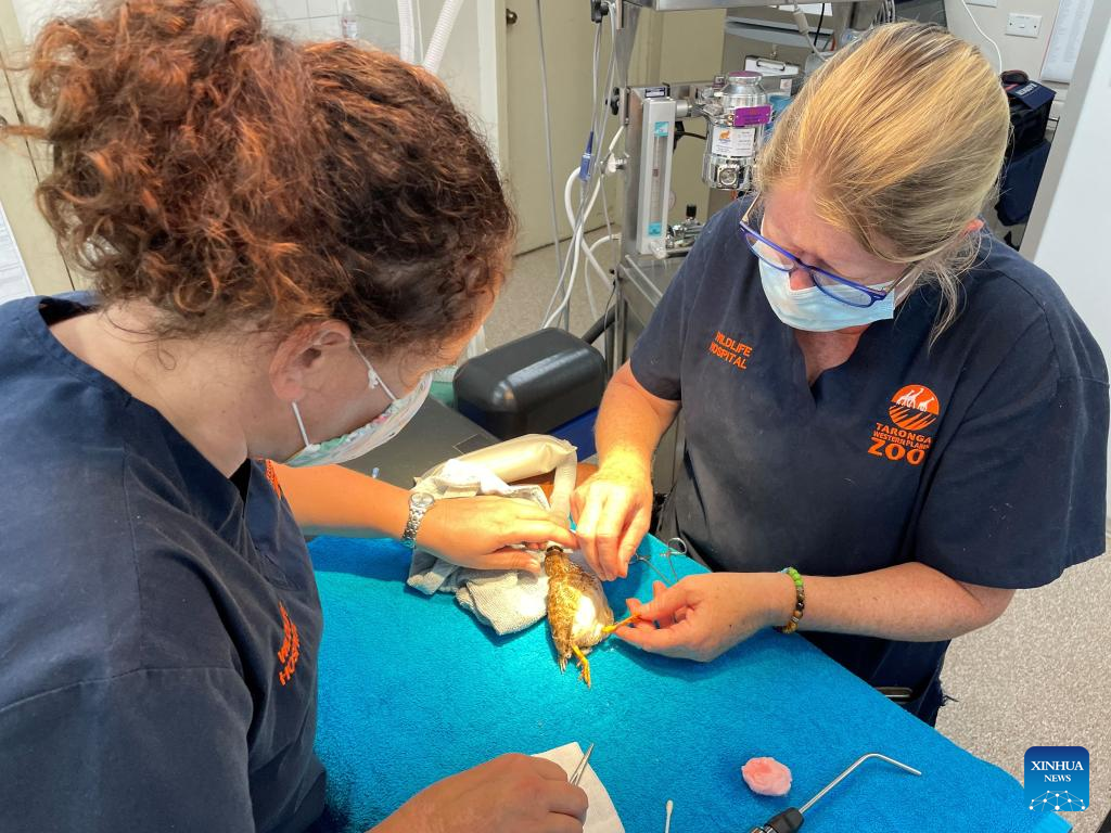 A plains-wanderer gets health check in Sydney, Australia, on March 15, 2022. (Photo by Stephanie Jones/Handout via Xinhua)