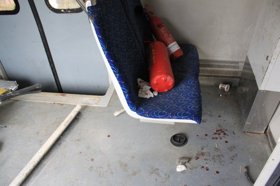 Photo shows bloodstains in a damaged train after two trains collided in the south of Tunisia's capital Tunis, on March 21, 2022. (Photo by Adel Ezzine/Xinhua)