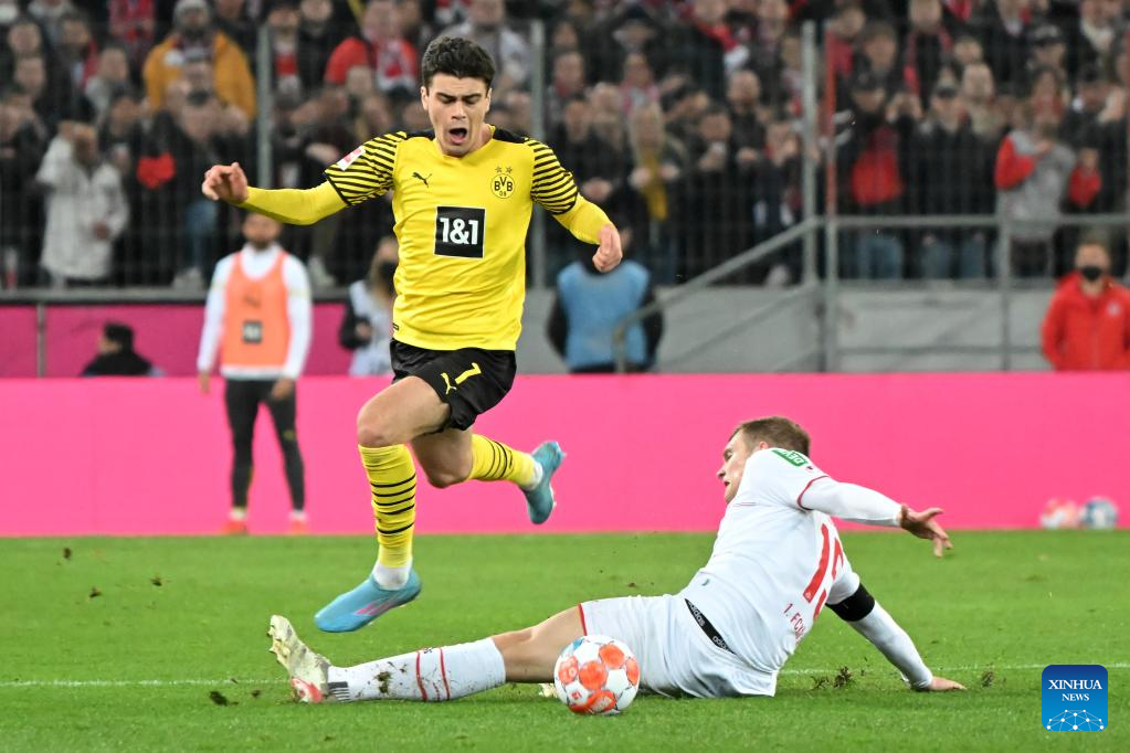 Giovanni Reyna (top) of Dortmund vies with Luca Kilian of Cologne during the German Bundesliga football match between FC Cologne and Borussia Dortmund in Cologne, Germany, March 20, 2022. (Photo by Ulrich Hufnagel/Xinhua)