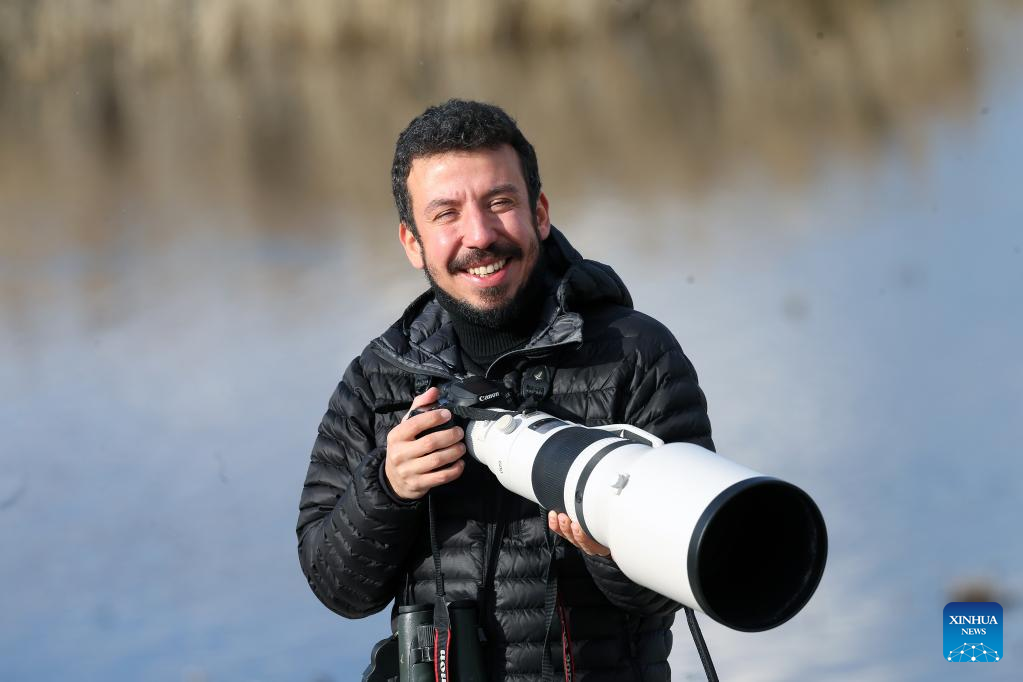 Emin Yogurtcuoglu, a 35-year-old bird watcher, works at Lake Mogan in Ankara, Turkey, on March 18, 2022. Emin Yogurtcuoglu, a Turkish self-proclaimed "bird detective," is constantly seeking new bird species around the world, and he wants to make his next trip to China, land of many species and home to abundant wildlife. (Photo by Mustafa Kaya/Xinhua)