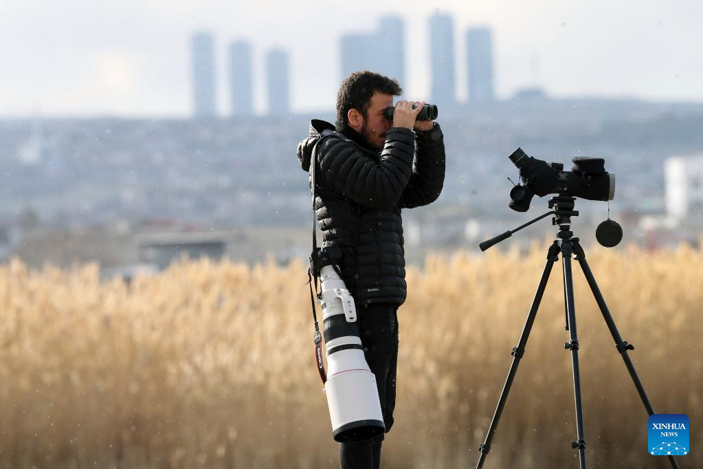 Emin Yogurtcuoglu, a 35-year-old bird watcher, watches birds at Lake Mogan in Ankara, Turkey, on March 18, 2022. Emin Yogurtcuoglu, a Turkish self-proclaimed "bird detective," is constantly seeking new bird species around the world, and he wants to make his next trip to China, land of many species and home to abundant wildlife. (Photo by Mustafa Kaya/Xinhua)