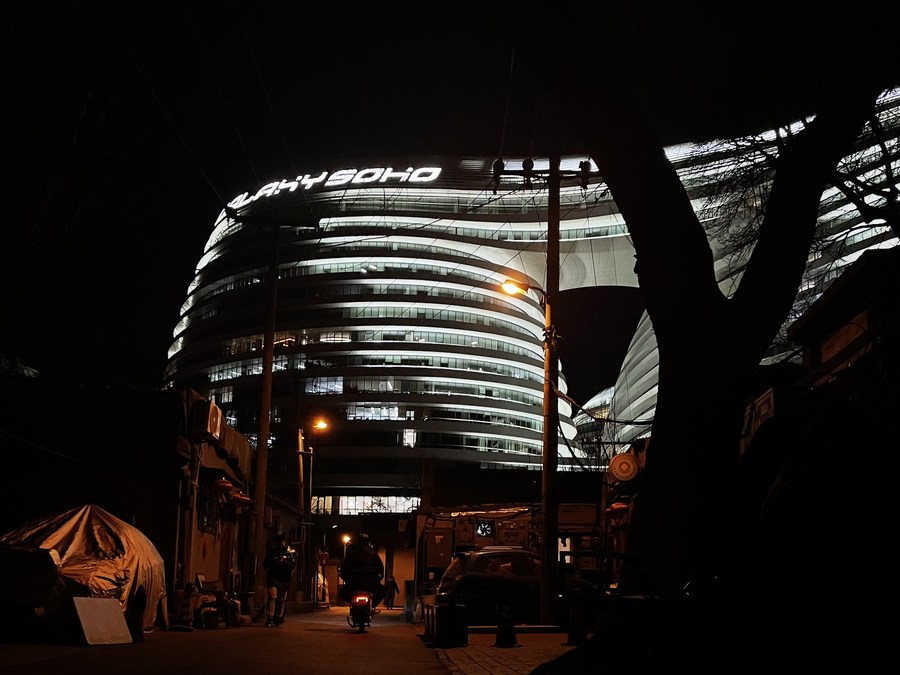 Photo taken with a mobile phone shows the Galaxy Soho in Beijing, capital of China, Feb. 21, 2022. (Xinhua/Chu Jiayin)