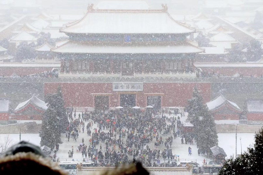 Photo taken with a mobile phone shows people visiting the Palace Museum in Beijing, capital of China, Feb. 22, 2022. (Xinhua/Li Xin)