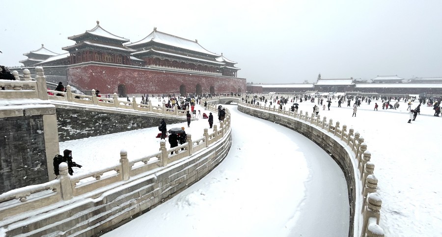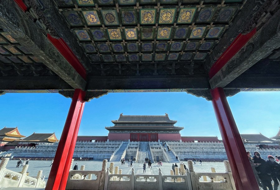 Photo taken with a mobile phone shows people visiting the Palace Museum in Beijing, capital of China, Feb. 13, 2022. (Xinhua/Li Xin)