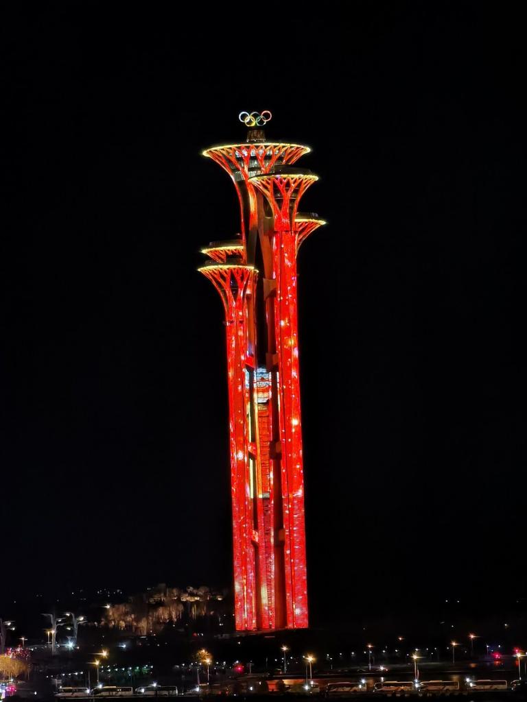 Photo taken with a mobile phone shows the Beijing Olympic Tower in Beijing, capital of China, Feb. 4, 2022. (Xinhua/Tu Ming)
