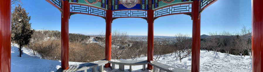 Photo taken with a mobile phone shows a pavilion at the Xishan National Forest Park in Beijing, capital of China, Feb. 14, 2022. (Xinhua/Yin Dongxun)