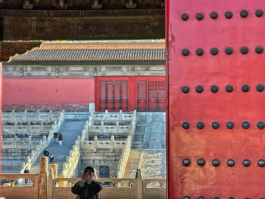 Photo taken with a mobile phone shows a man taking photos in the Palace Museum in Beijing, capital of China, Feb. 22, 2022. (Xinhua/Li Xin)