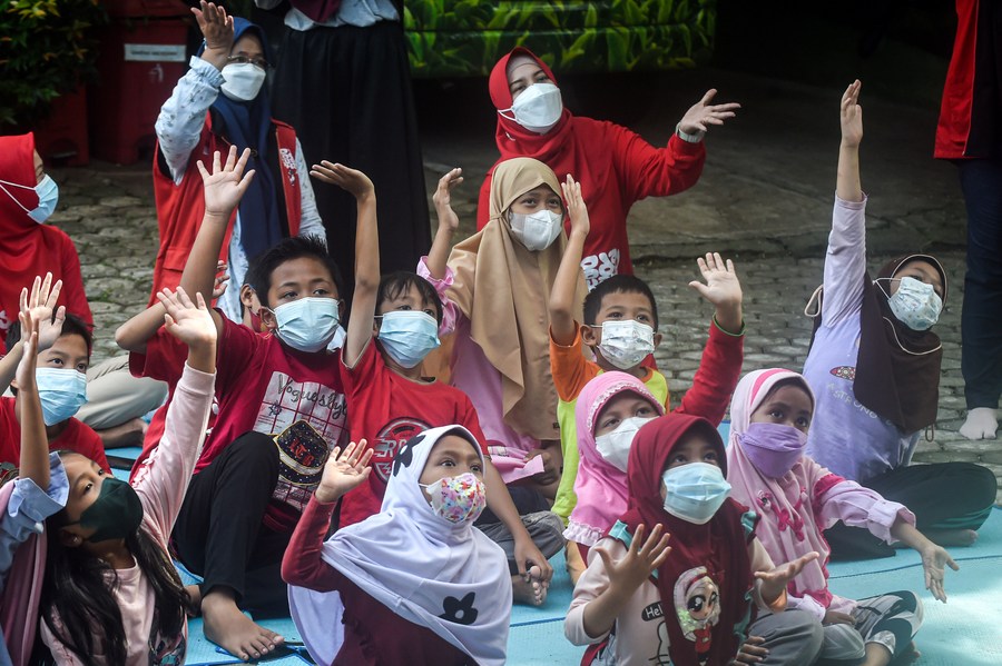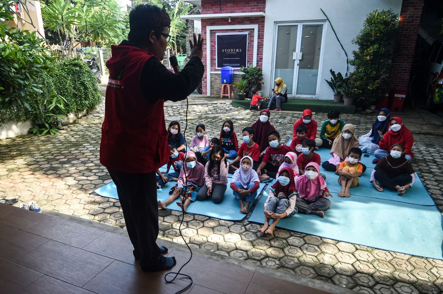 Children interact with speaker at a storytelling event on World Storytelling Day in Kampong Dongeng community in Indonesia's Banten Province on March 20, 2022. (Xinhua/Agung Kuncahya B.)
