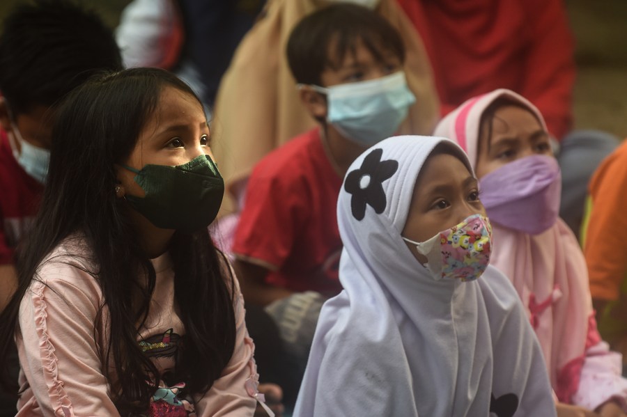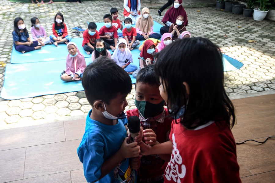 Children sing a song at a storytelling event on World Storytelling Day in Kampong Dongeng community in Indonesia's Banten Province on March 20, 2022. (Xinhua/Agung Kuncahya B.)