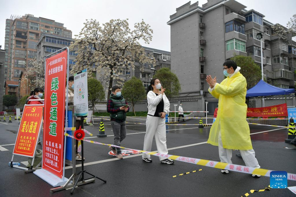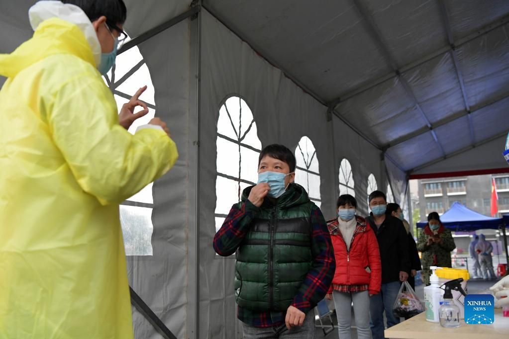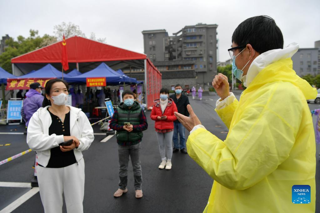 Volunteer Li Huanqiu (1st L) uses sign language to guide hearing-impaired residents during a COVID-19 nucleic acid test at a testing site in Nanchang, east China's Jiangxi Province, March 21, 2022. Li, a hearing-impaired teacher at a special education school, has been volunteering at a nucleic acid testing site in Nanchang since March 19, offering help to hearing-impaired residents in their COVID-19 tests. (Xinhua/Peng Zhaozhi)