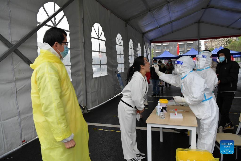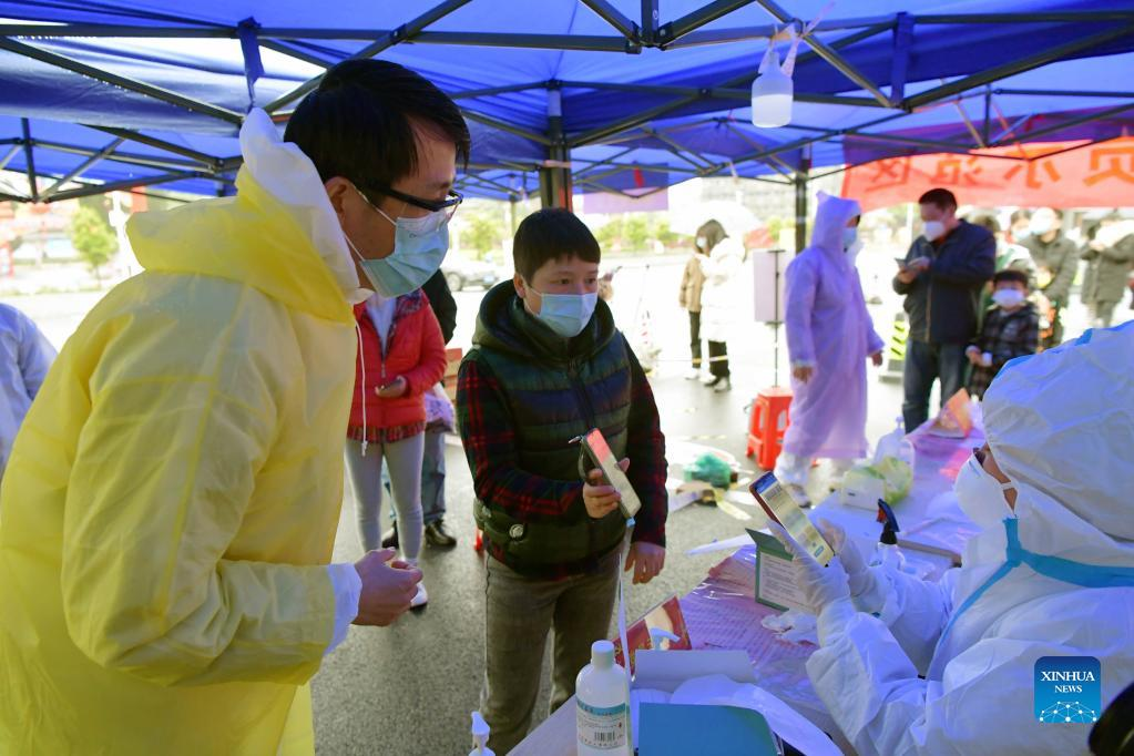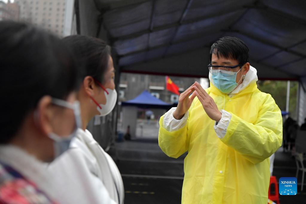 Volunteer Li Huanqiu looks on as hearing-impaired residents take COVID-19 nucleic acid tests at a testing site in Nanchang, east China's Jiangxi Province, March 21, 2022. Li, a hearing-impaired teacher at a special education school, has been volunteering at a nucleic acid testing site in Nanchang since March 19, offering help to hearing-impaired residents in their COVID-19 tests. (Xinhua/Peng Zhaozhi)