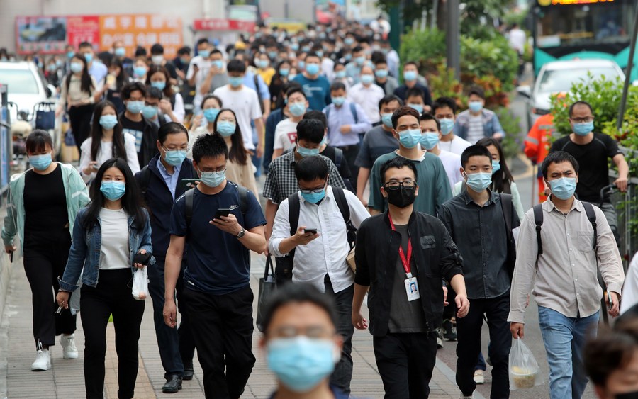 Citizens are on their way to work at an industrial park in Shenzhen, south China's Guangdong Province, March 21, 2022. Government offices, enterprises, and businesses in the southern Chinese metropolis of Shenzhen have resumed normal work and production from Monday as the latest COVID-19 resurgence subsides. The city has also resumed bus and subway services from Monday. (Photo by Li Weiwen/Xinhua)
