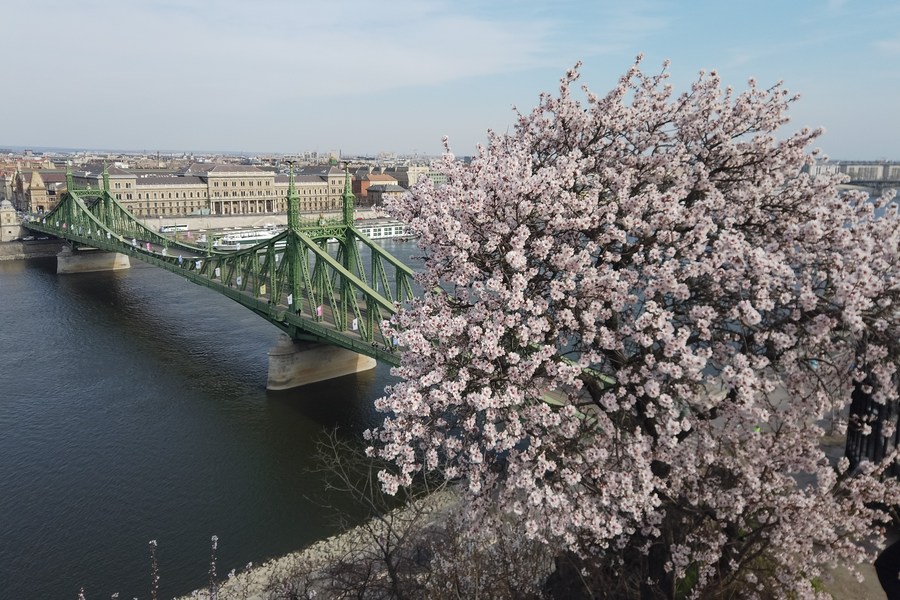 Blooming almond tree with the view of downtown of the city in the background is seen from a hill in Budapest, Hungary on March 20, 2022. (Photo by Attila Volgyi/Xinhua)■