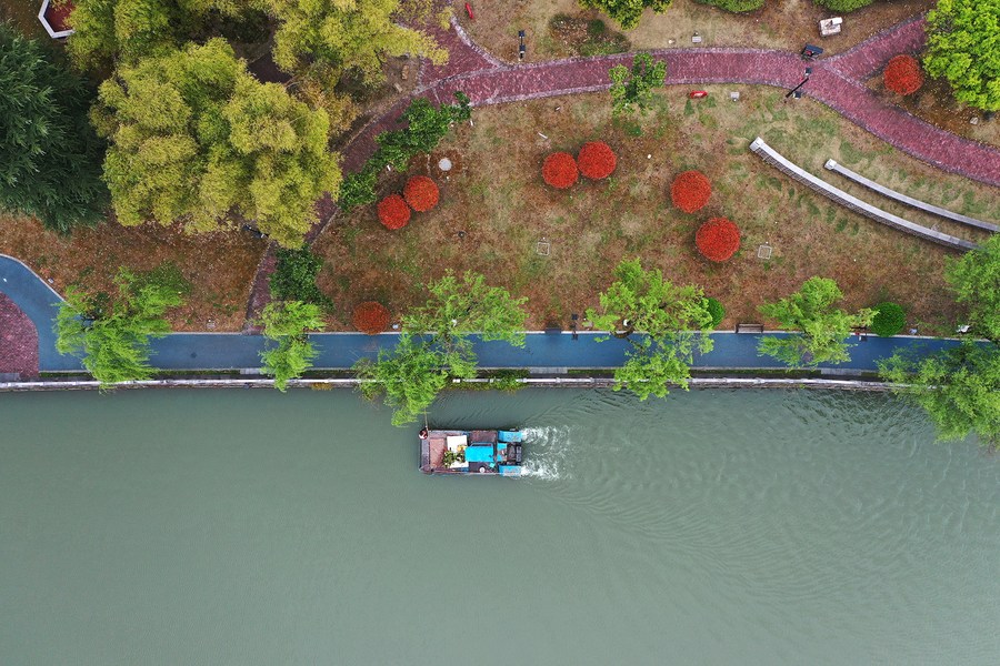 Aerial photo taken on March 21, 2022 shows sanitation workers collecting garbage on Niuchang River in Yuqing County of Zunyi, southwest China's Guizhou Province. (Photo by Mu Mingfei/Xinhua)