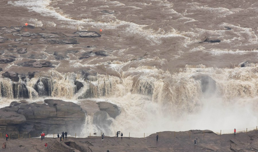 Tourists enjoy the scenery of Hukou Waterfall on the Yellow River in Jixian County, north China's Shanxi Province, March 20, 2022. (Photo by Lyu Guiming/Xinhua)