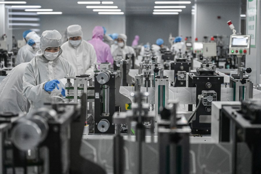 Staff members work at a workshop of a mask manufacturer in Jinjiang, Quanzhou, southeast China's Fujian Province, March 21, 2022. (Photo by Zhou Yi/Xinhua)