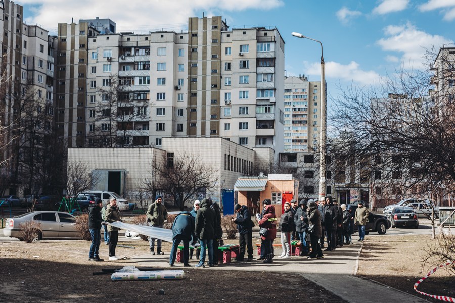 People line up to get plastic covers to mend broken windows on March 17, 2022 in Kiev, Ukraine. Ukrainian President Volodymyr Zelensky signed a bill extending martial law in Ukraine, the press service of Ukraine's parliament said Sunday. The legislation extended the current martial law for 30 days starting March 26. (Photo by Diego Herrera/Xinhua)