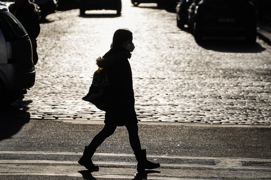 A pedestrian wearing a face mask walks on a street in Berlin, capital of Germany, on Feb. 2, 2022. (Photo by Stefan Zeitz/Xinhua)